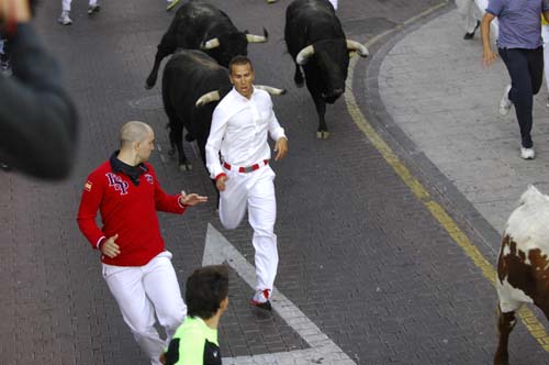 Encierro del 28 de agosto de 2012 Imágenes del encierro del 28 de agosto de 2012 Ir a la página Anterior Siguiente Momento en que los corredores enfilan el tunel de las plaza de toros 'La Tercera Un momento de una carrera en el tramo de la c/ Real Vista de un momento de la carerra con corredores ante astas Un momento de la carrera en el tramo de la c/Real acercándose a c/ Estafeta Un corredor en el momento de finalizar la carrera