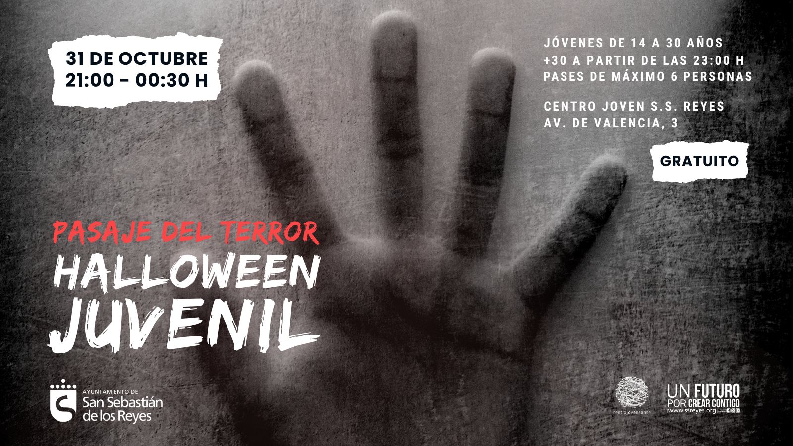 La actividad, dirigida a jóvenes de 14 a 30 años (y mayores de 30 a partir de las 23:00 h.), se desarrollará el 31 de octubre de 21:00 a 00:30 h. con pases de hasta seis personas.
