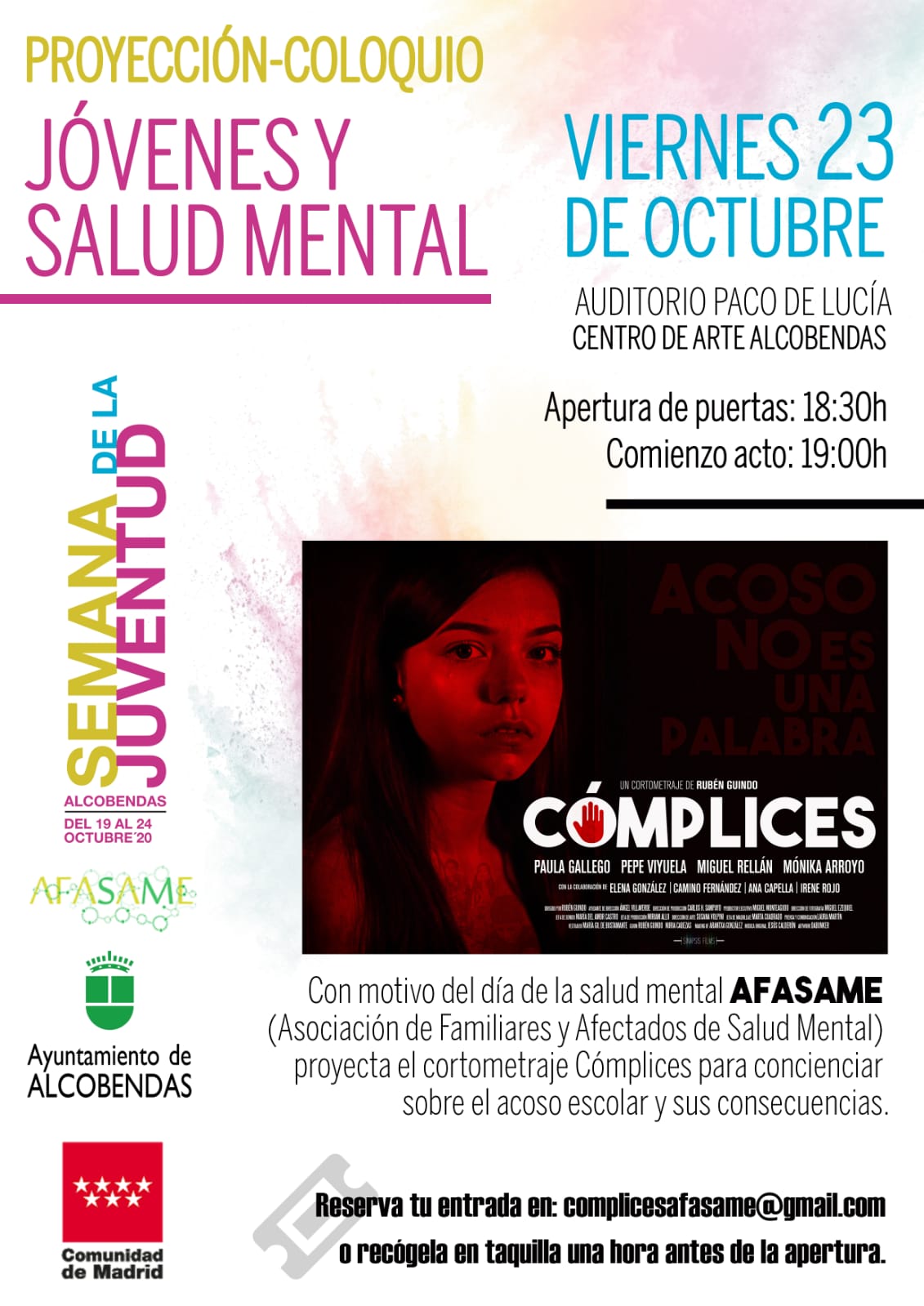 AFASAME, ASOCIACIÓN DE FAMILIARES Y AFECTADOS DE SALUD MENTAL Y CON MOTIVO DEL DÍA MUNDIAL DE LA SALUD MENTAL, PROYECTARÁ EL PRÓXIMO 23 DE OCTUBRE, EL CORTOMETRAJE "CÓMPLICES" PARA CONCIENCIAR SOBRE EL ACOS ESCOLAR Y SUS CONSECUENCIAS.